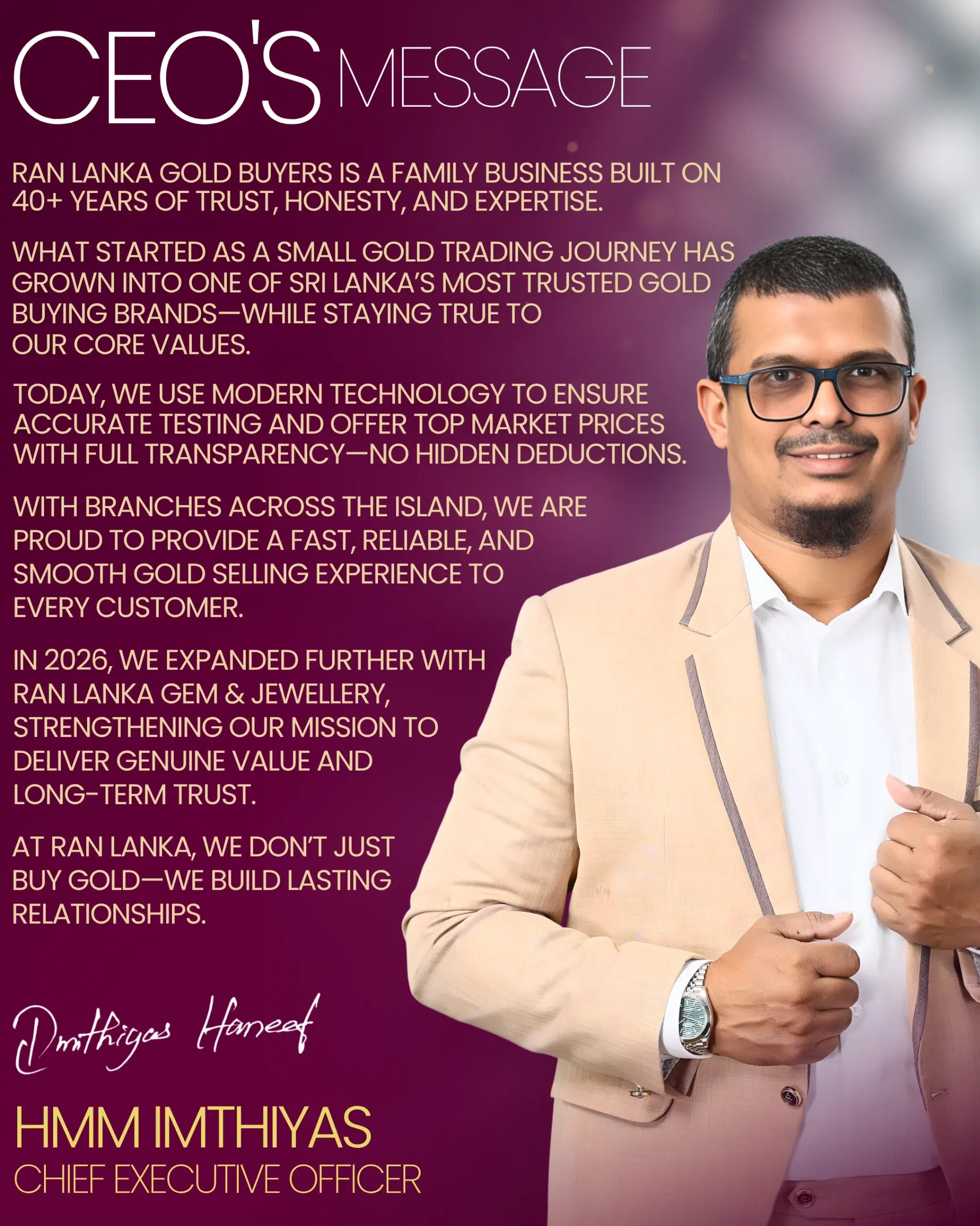 Posted on nalin RanasuriyaTrustindex verifies that the original source of the review is Google. good place to sell gold best gold buyer in sri lankaPosted on ashira bandaraTrustindex verifies that the original source of the review is Google. Best rates‚ Frendly service.👍Posted on Arafath DeenTrustindex verifies that the original source of the review is Google. Excellent customer service Best gold buyer in sri lanka ran lanka head office branch staff also very friendlyPosted on Tuder seneviratneTrustindex verifies that the original source of the review is Google. Best servicePosted on Tharindu DeemanthaTrustindex verifies that the original source of the review is Google. I would like to sincerely thank Mr. Imthiyas for his excellent and transparent service. From start to finish, everything was handled professionally, honestly, and with great attention to detail. It’s truly refreshing to deal with someone who is genuine and dedicated to his work. I highly appreciate his commitment and the way he takes care of his customers. I strongly recommend his service to anyone looking for a trustworthy and reliable business. Wishing you continued growth and great success in everything you do. May the Triple Gems bless you, and God bless you always.Posted on Deepal MuthunayakeTrustindex verifies that the original source of the review is Google. We are extremely satisfied with the service. This is the optimal location for selling gold jewelry in Sri Lanka, offering reasonable prices and exceptional customer service.Posted on Susheni PeirisTrustindex verifies that the original source of the review is Google. Prompt and friendly staff and excellent service. Thank you 🙏Posted on Jayantha PeirisTrustindex verifies that the original source of the review is Google. Real-time genuine valuation ,accurate weighing, spot cash, An excellent service provided. The best place to sell your gold to get real marketing value.Verified by TrustindexTrustindex verified badge is the Universal Symbol of Trust. Only the greatest companies can get the verified badge who has a review score above 4.5, based on customer reviews over the past 12 months. Read more